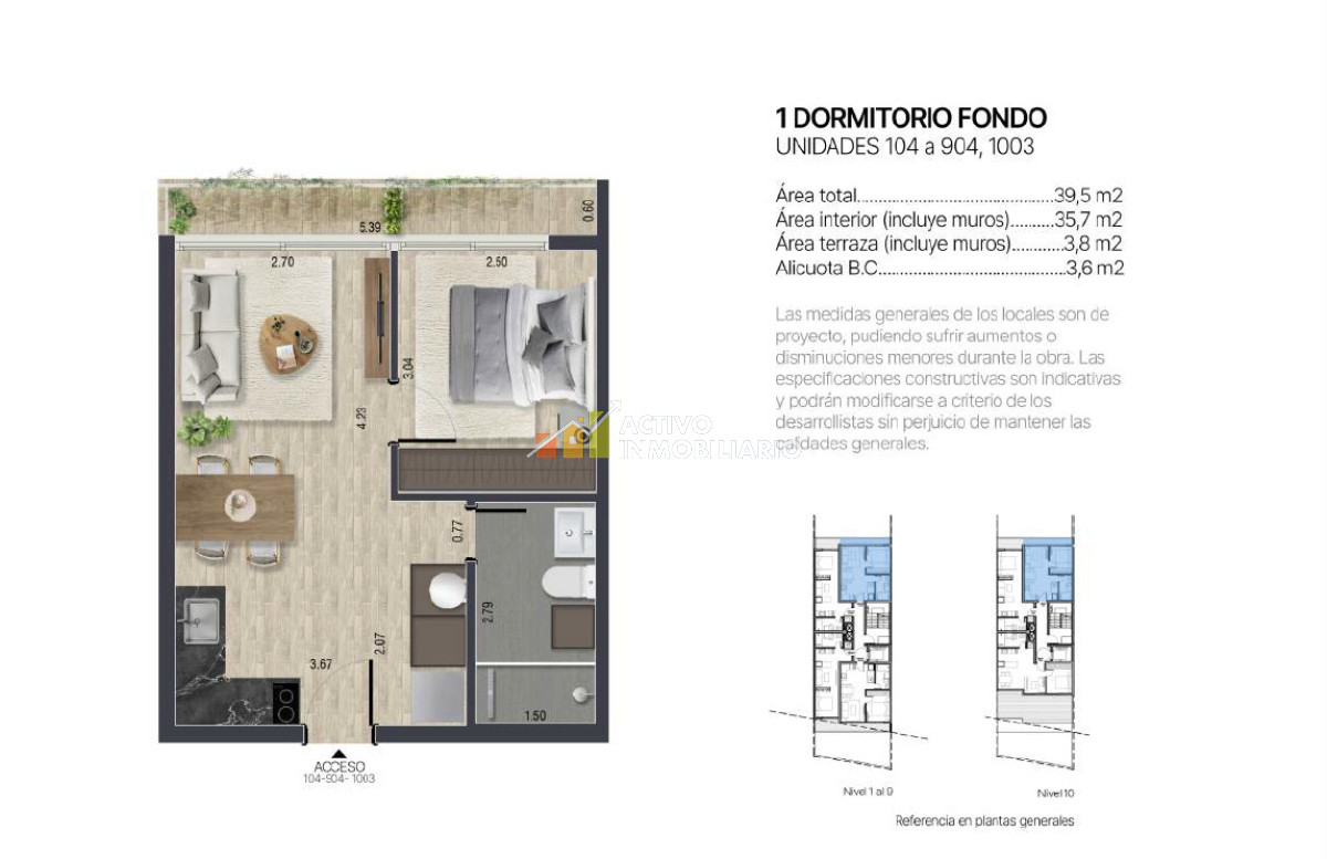 Cuenta con 12 pisos y 39 apartamentos entre monoambientes y 1 dormitorio.