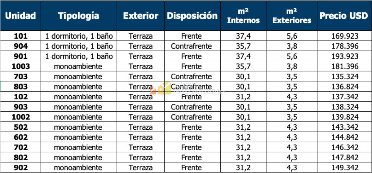 | Unidad | Dormitorios | Baños | Superficie | Precio |
